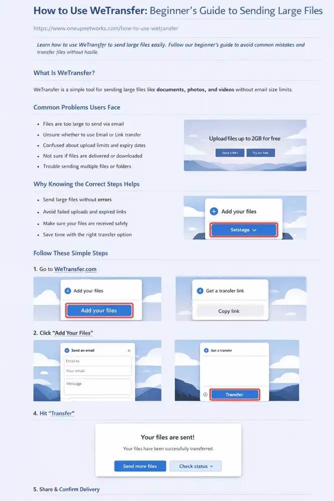 WeTransfer file sharing guide is an easy and reliable way to send large files without technical complexity. Knowing the correct steps ensures smooth uploads, successful deliveries, and a better experience for both sender and recipient.